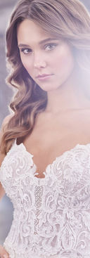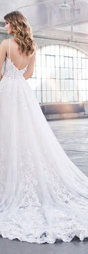 Truly unforgettable, this allover sequin lace, tulle, and organza A-line gown offers lace trimmed spaghetti strap, a plunging sweetheart neckline, a semi-sheer boned bodice with corded lace appliques, a natural waist, a low curved zipper back, and a full gathered skirt with corded lace appliques, a scalloped hem and a chapel train.